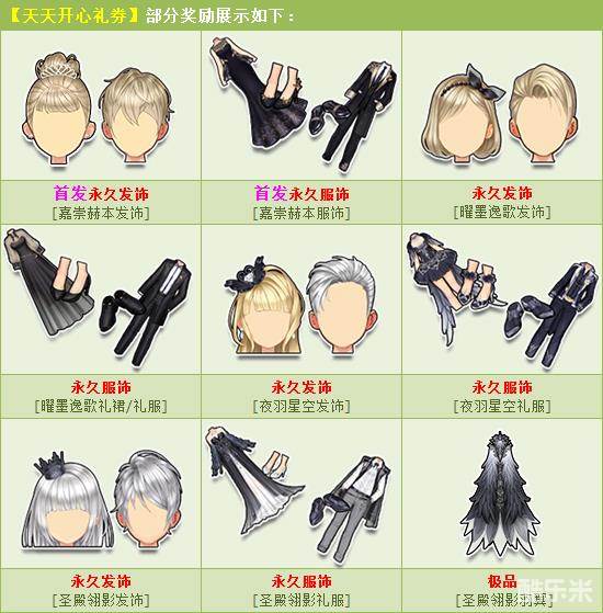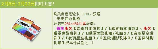 2月8日-3月22日购买角色经验卡+300,获赠:天天开心礼券,开启有几率获得:首发永久【嘉崇赫本发饰】/【嘉崇赫本服饰】、永久【曜墨逸歌发饰】/【曜墨逸歌礼裙/礼服】/【夜羽星空发饰】/【夜羽星空礼服】/【圣殿翎影发饰】/【圣殿翎影礼服】或其他奖励之一!获得核心奖励永久型概率是:2%-4%,获得核心奖励期限型概率是:4%-6%,获得非核心奖励概率是:90%-94%。