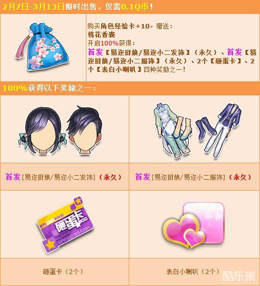 2月7日-3月13日购买角色经验卡+10,赠送:桃花香囊,开启100%获得:首发【易迩厨娘/易迩小二发饰】(永久)、首发【易迩厨娘/易迩小二服饰】(永久)、2个【砸蛋卡】、2个【表白小喇叭】四种奖励之一!