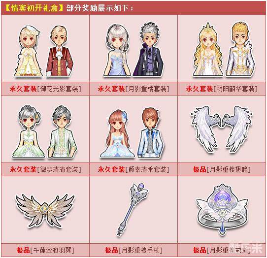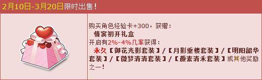 2月10日-3月20日购买角色经验卡+300,获赠:情窦初开礼盒,开启有几率获得:永久【御花光影套装】/【月影重楼套装】/【明阳韶华套装】/【微梦清清套装】/【颜素清禾套装】或其他奖励之一!获得核心奖励永久型概率是:2%-4%,获得核心奖励期限型概率是:4%-6%,获得非核心奖励概率是:90%-94%。