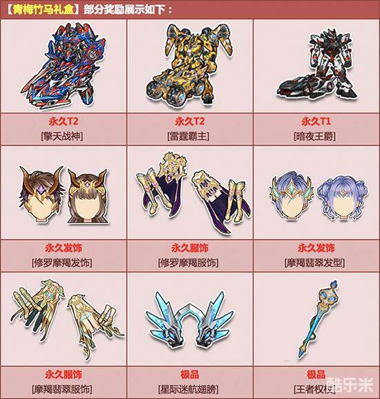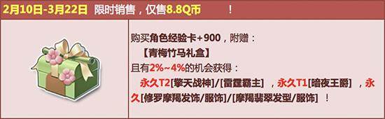 2月10日-3月22日,在飞车商城购买【角色经验卡+900】,赠送【青梅竹马礼盒】,开启有机会获得永久T2【擎天战神】/【雷霆霸主】、永久T1【暗夜王爵】、永久【修罗摩羯发饰/服饰】/【摩羯翡翠发型/服饰】!其中核心极品期限型概率范围为:4%-6%,核心奖励永久型概率范围为:2%-4%,非核心奖励概率范围为:90%-94%!