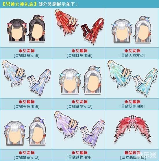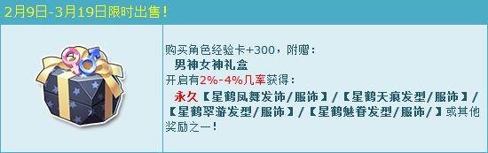 2月9日-3月19日购买角色经验卡+300,附赠:男神女神礼盒,开启有几率获得:永久【星鹤凤舞发饰/服饰】/【星鹤天痕发型/服饰】/【星鹤翠游发型/服饰】/【星鹤魅眷发型/服饰/】或其他奖励之一!获得核心奖励永久型概率是:2%-4%,获得核心奖励期限型概率是:4%-6%,获得非核心奖励概率是:90%-94%。