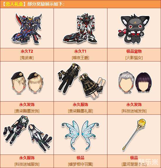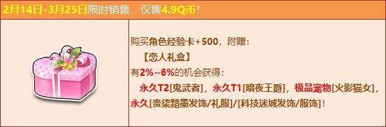 2月14日-3月25日,在飞车商城购买【角色经验卡+500】,赠送【恋人礼盒】,开启有机会获得永久T2【鬼武者】、永久T1【暗夜王爵】、极品【火影猫女】、永久【贵柒黯墨发饰/礼服】/【科技迷城发饰/服饰】!其中核心极品期限型概率范围为:4%-6%,核心奖励永久型概率范围为:2%-4%,非核心奖励概率范围为:90%-94%。