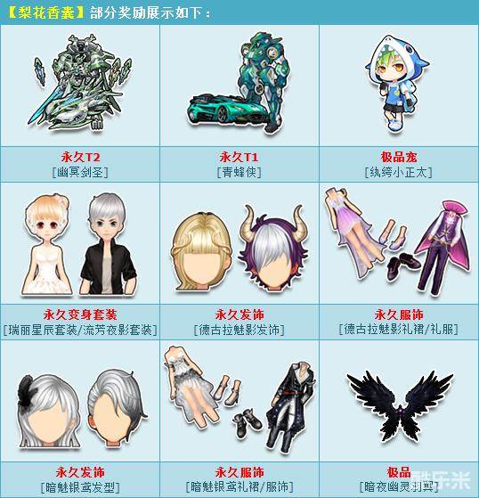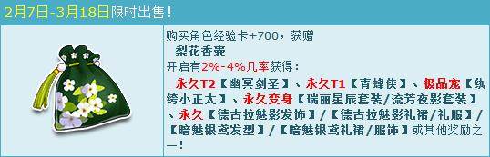 2月7日-3月18日购买角色经验卡+700,获赠梨花香囊,开启有几率获得:永久T2【幽冥剑圣】、永久T1【青蜂侠】、极品宠【纨绔小正太】、永久变身【瑞丽星辰套装/流芳夜影套装】、永久【德古拉魅影发饰】/【德古拉魅影礼裙/礼服】/【暗魅银鸢发型】/【暗魅银鸢礼裙/服饰】或其他奖励之一!获得核心奖励永久型概率是:2%-4%,获得核心奖励期限型概率是:4%-6%,获得非核心奖励概率是:90%-94%。