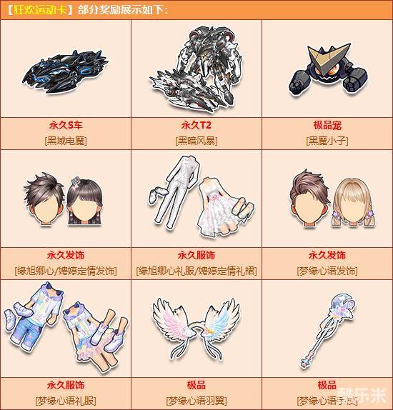2月12日-3月20日,在飞车商城购买【角色经验卡+900】,赠送【狂欢运动卡】,开启有机会获得永久S车【黑域电魔】、永久T2【黑暗风暴】、极品宠【黑魔小子】、永久【娉婷定情发饰/缘旭卿心发饰/礼裙/礼服】/【梦缘心语发饰/礼服】!其中核心极品期限型概率范围为:4%-6%,核心奖励永久型概率范围为:2%-4%,非核心奖励概率范围为:90%-94%!