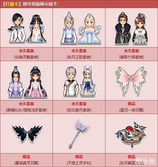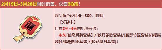 2月19日-3月28日,在飞车商城购买【角色经验卡+300】,赠送【灯谜卡】,有机会得永久【仙缘灵鹤套装】/【秋月芷歌套装】/【碧影竹瑶套装】/【樱摇浅梦/紫檀如水套装】/【轻花邀月套装】或其他奖励之一!其中核心极品期限型概率范围为:4%-6%,核心奖励永久型概率范围为:2%-4%,非核心奖励概率范围为:90%-94%。