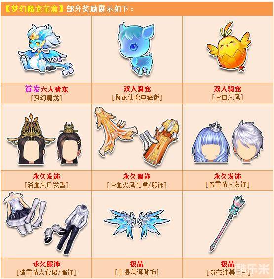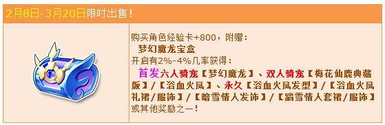 2月8日-3月20日购买角色经验卡+800,附赠:梦幻魔龙宝盒,开启有几率获得:首发六人骑宠【梦幻魔龙】、双人骑宠【梅花仙鹿典藏版】/【浴血火凤】、永久【浴血火凤发型】/【浴血火凤礼裙/服饰】/【暗雪情人发饰】/【踏雪情人套裙/服饰】或其他奖励之一!获得核心奖励永久型概率是:2%-4%,获得核心奖励期限型概率是:4%-6%,获得非核心奖励概率是:90%-94%。