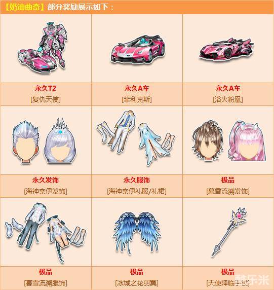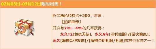 2月3日-3月12日期间,购买【角色经验卡+500】,赠送奶油曲奇,有机会得永久T2【复仇天使】、永久A车【菲利克斯】/【浴血粉凤】、永久【海神奈伊发饰】/【海神奈伊礼服/礼裙】或其他奖励之一!其中核心奖励期限型概率为4%-6%,核心奖励永久型概率为2%-4%,非核心奖励概率为90%-94%。