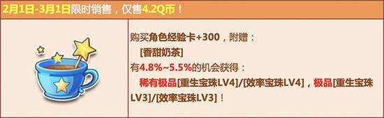2月1日-3月1日,在飞车商城购买【角色经验卡+400】,赠送【香甜奶茶】,获赠纯宝石、改装道具!重生宝珠LV4、效率宝珠LV4!珍稀宝石,不容错过!其中核心奖励永久型概率范围为:4.8%-5.5%,非核心奖励概率范围为:94.5%-95.2%。