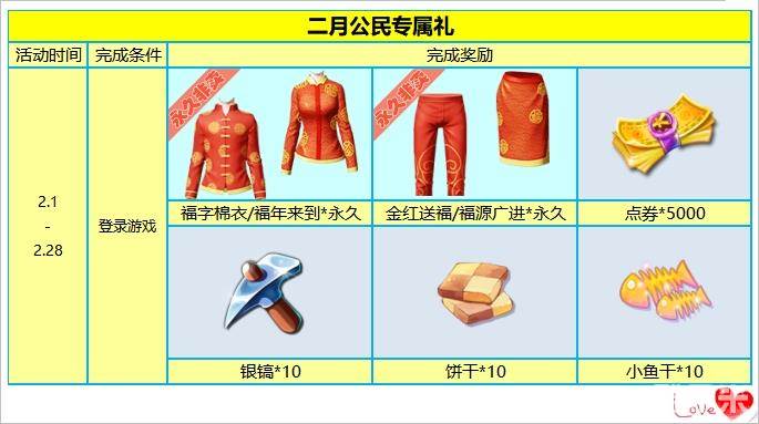 2.1-2.28期间登录游戏,即可领取二月公民专属礼,全新永久精美服饰送给你,福运到祝你天天好运来,还有更多实用小道具,千万别错过哟!