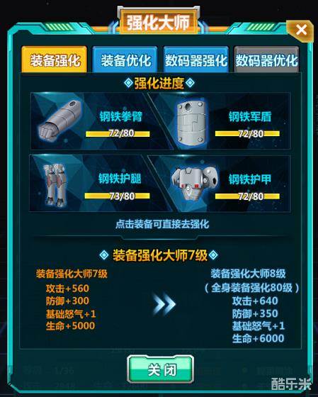 装备有了,强化跟不上进度是第一个问题,所以合理的强化装备顺序也是值得考究的。强化装备的话,个人比较推荐以10级为一个单位,优先提升强化大师等级为基础的方式来提升战斗力。前期强化大师的每级等级提升都能提升较为可观的战斗力,优先强化一套来激活强化大师等级是很有比较的,装备强化的话自然也是推荐优先强化核心数码兽的装备。