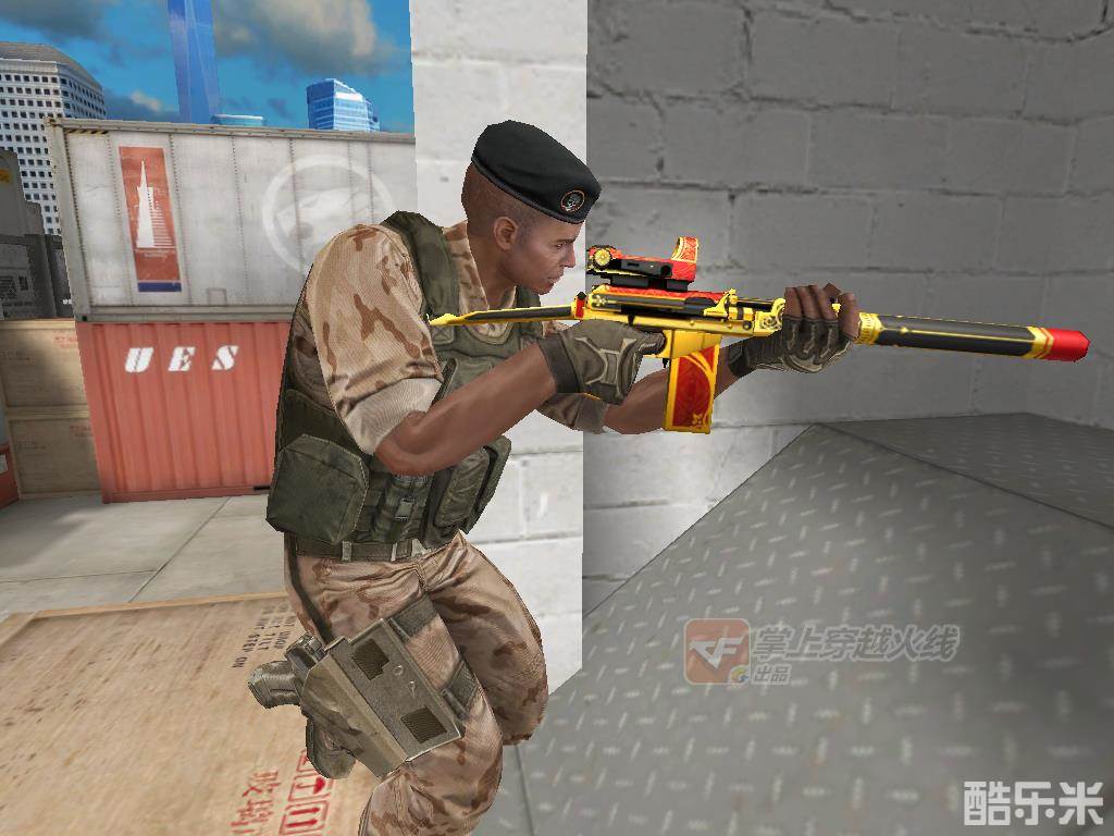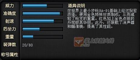 在世界上最小步枪9A-91基础上经过秘密改造,使用金色特殊材质制成,从而减轻了枪支的重量。红色加上金色点缀的外观极其华丽。此外,还装载了消音器和瞄准镜,提高了其性能。等一下,画一下重点:消音器和瞄准镜?如果9A91和这两样配件结合会是什么样子呢?