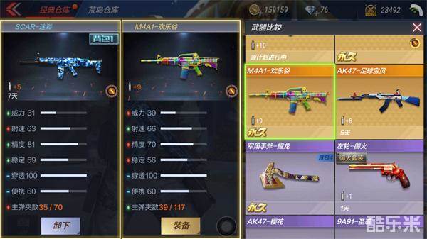 如图,SCAR-迷彩和橙色品质的M4A1-欢乐谷相比,前者威力、精度、稳定性高出后者,射速、主弹夹数低于后者,其他保持一致,即:若论实战效果,前者更佳;反之,若是比续航、射速,则后者偏强。