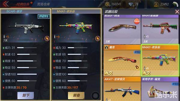 如图,SCAR-狼牙和M4A1-欢乐谷相比,前者威力、精度、稳定高于后者,射速、主弹夹数低于后者,其他保持一致,即:论输出伤害、命中率,后者占优;论续航时间、压制性,后者占优。
