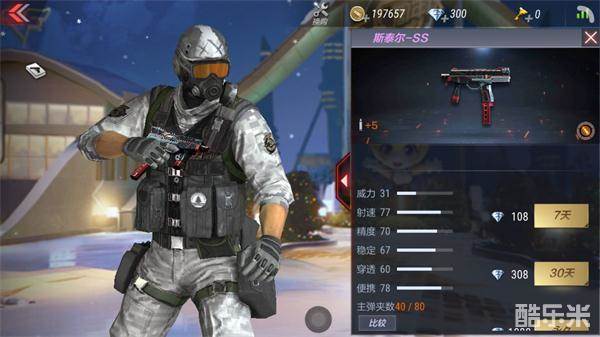如图,这是紫色品质冲锋枪——斯太尔-SS的属性面板。可以看到,前者射速、精度和主弹夹数领先后者,威力、精度和便携落后于后者,即:若作战续航和压制性,前者占优;论输出强度,后者占优。因此,两者半斤八两。
