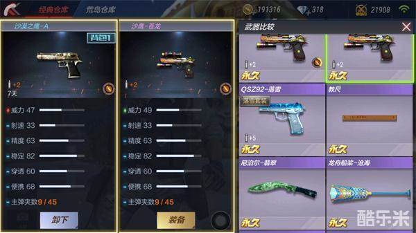 如图,沙漠之鹰-A 和紫色品质的沙鹰-苍龙相比,前者输出威力低于后者,其他数据保持一致。不过,因后者配置有瞄准镜,因而在实用性上后者更高。