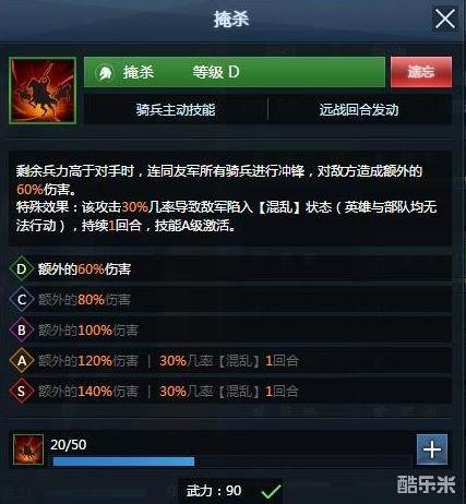 除了那些初始带有【掩杀】的武将,其他英雄也可通过后天培养习得此技能,但学习时需要满足对应条件和技能碎片,如【掩杀】对英雄武力就有较高的要求,且英雄品质必须为金,(紫色英雄可通过突破升级为金色),游戏初期可让吕布和关羽两大战神学习