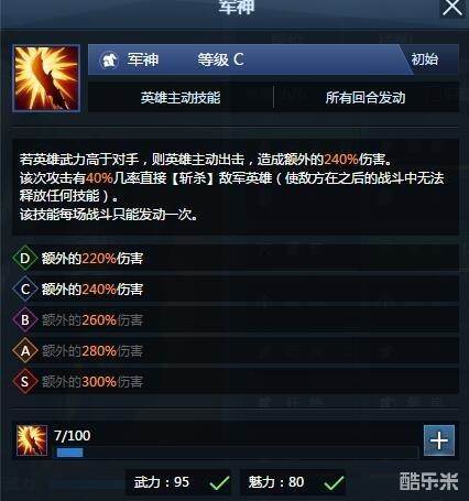 骑兵系技能与英雄武力挂钩,步兵系技能与英雄统帅挂钩,弓兵系技能与英雄智力相关,弩兵系技能与英雄魅力相关,其中,掩杀、冲锋、箭岚为核心技能,在满足条件时,拥有该技能的英雄在他的回合,将连同所有友军一起发动攻击。
