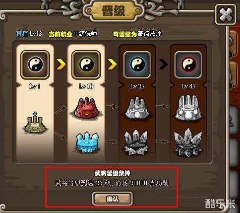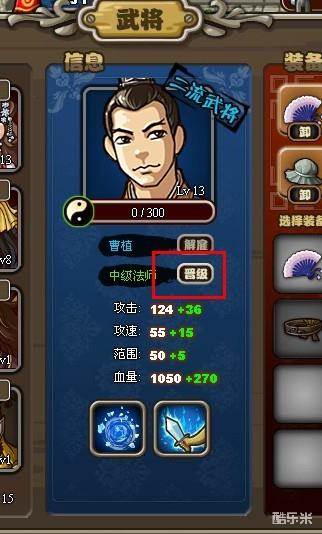 打开武将列表可以看到武将的资料和装备,点晋级就好了。