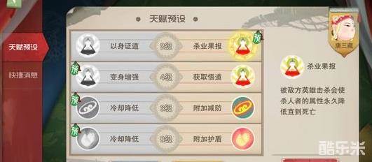 推荐理由:唐三藏是一个可以变身的英雄,需要靠悟道值来变身,需要通过刷小怪拿经书与杀人、随着时间流逝来增加,变身之前伤害只有2技能,可以说只是一个辅助类型的,所以为了让唐三藏变成输出,我们2级天赋我们选择杀业果报,杀业果报可以让敌方击杀你之后属性降低直至死亡,其实差不多等于要死亡一次,不然属性降低会很难受,除非是决胜时刻可以逃跑。4级我们选择获取悟道,可以立刻获取1格悟道值,毕竟悟道值不好获取。6级我们选择2技能附加减防的天赋,2技能的CD较短,也算是主要的输出方式,减防可以让唐三藏打出伤害。8级选择附加护盾,如来神掌可以变成一个辅助技能,既能输出又能为友方增加护盾,非常全面。