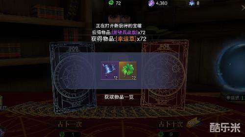 7、每占卜完1次会获得1点幸运值,当幸运值累计达200时占卜必得S级奖励。每占卜一次还获60点幸运积分,幸运积分可在幸运商店兑换命运之门入场券,这个是参加命运之门副本的必需品。