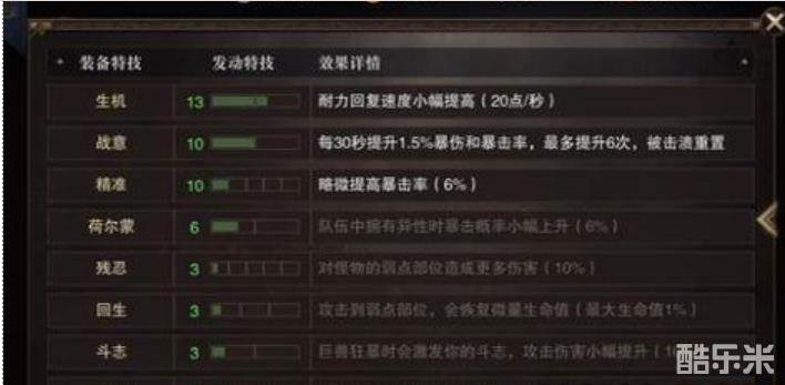 固定增加6点暴击率,进入副本后180秒叠加满战意特技,增加,7.5点暴击率和暴击伤害,耐力恢复速度增加20点每秒,火元素抗性负20多点
