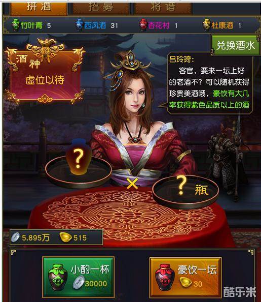 4.通过兑换酒水,可以将低品质的酒水兑换成高品质的酒水,兑换比例为5:1。