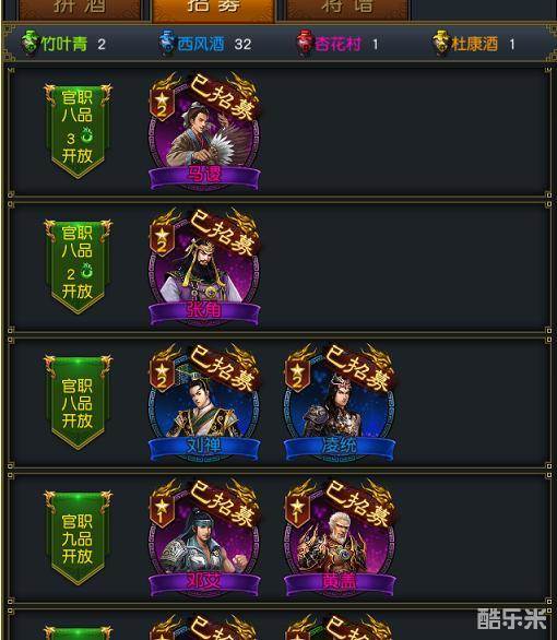 4.通过消耗一定数量不同品质的酒水来招募不同品质星级的武将。