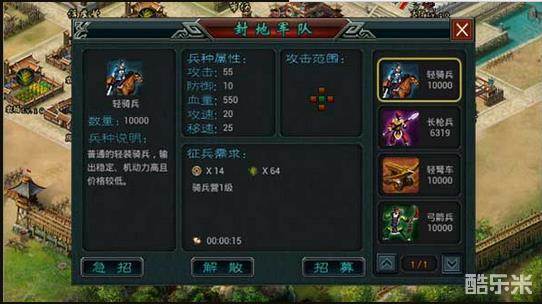 校场可以查看当前封地军队情况,还可在校场进行各类兵种的招募和解散。
