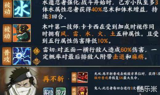 分析:技能搭配里好像出了奇怪的东西?不用在意的,反正神威卡卡西已经是脆皮之王了,还怕什么呢。不服就干,生死看淡!神威卡卡西是可以吃水遁的,然后呢,神威卡卡西的普攻又比较厉害,那直接和再不斩兄弟去无双吧,你不死就是我死。卡卡西用命开神威掩护再不斩的奥义,稳不稳?再不斩和卡卡西开完奥义就开干,什么续航,不需要的。直接砍起来,不要想那么多!