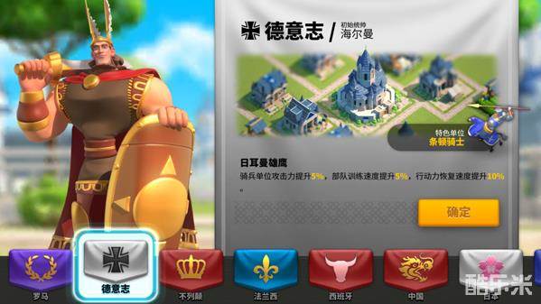 作为游牧民族出身的德意志文明,他们拥有出色的骑兵作战能力(骑兵单位攻击力提升百分之五),另外良好的军事训练体系,使得德意志文明的部队训练速度是所有文明中最快的(部队训练速度提升百分之五)。