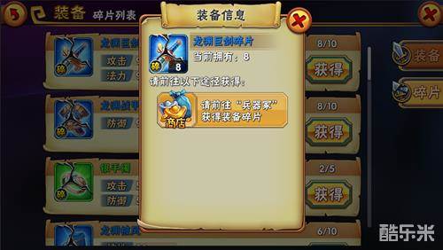 首先还是先说说怎么获得装备吧。我们在兵器冢可以获得装备碎片,而当累计一定数量的装备碎片时,就可以合成装备了。