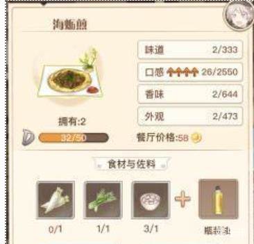 1. S级餐厅价格85,满属性2550,各方面超越第一金币菜-叻沙面,收益上正好高出叻沙面一个评级(S级海蛎煎相当于SS级的叻沙面),建议重点培养;