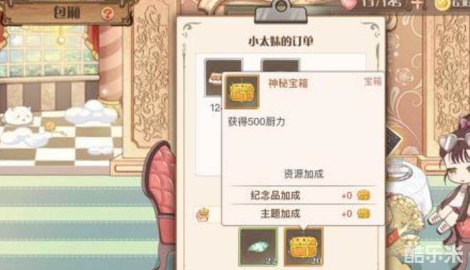 神秘箱子单个可以加500厨力,汤圆做了10次任务,出现了1次神秘箱子,有20个之多(23级包厢);