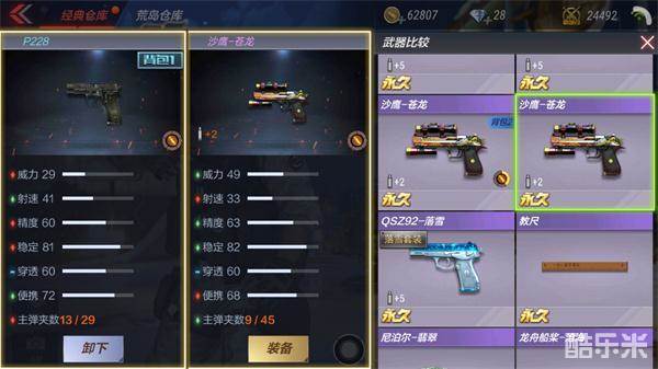 如图,P228和紫色品质的沙鹰-苍龙相比,前者威力、精度、稳定、主弹夹数低于后者,射速、便携、前置弹夹高于后者,其他保持一致,即:论伤害、精度,后者占优;论压制效果,前者占优。