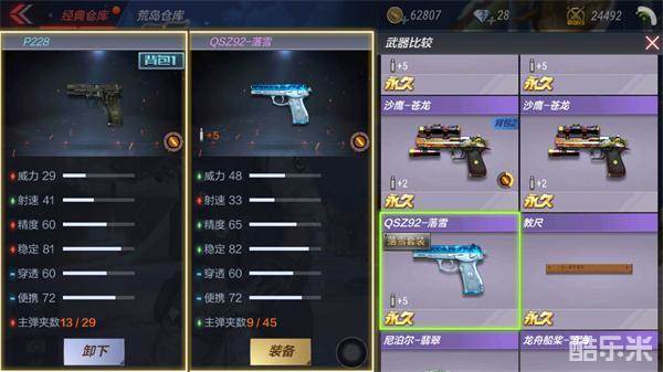 如图,P228和紫色品质的QSZ92-落雪相比,前者射速高于后者,便携、穿透保持一致,其他皆低于后者,即:两者具有较大的属性差距,不具备可比性。