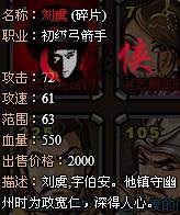 塔防三国志刘虞:弓箭手。攻击72、攻速61、范围63、血量550