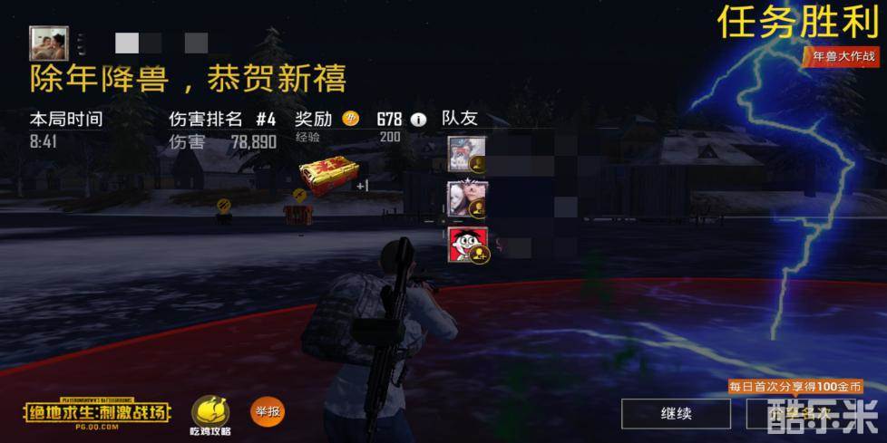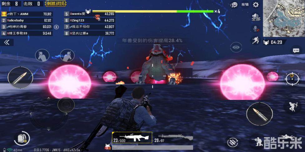 由于年兽的伤害非常高,在作战的同时还要注意躲避年兽的攻击,尤其是脚下的红圈以及滚动的光球,伤害非常高。切忌站位过于密切,年兽的攻击范围很大,如果每一次年兽都能击倒几个队友,那么通关的几率就很低了。看到队友倒地也不用紧张,复活时间仅需15S,只要不是全军覆没,那么15S后就能重新投入战斗。战场周围有补给点,里面装着枪械以及充足的子弹,不用担心子弹不足的情况出现。