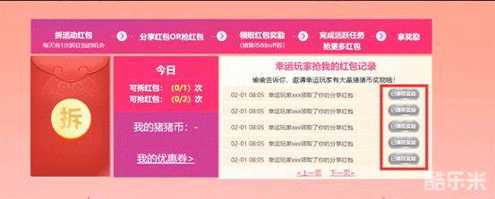 大家每天有1次来页面拆红包和2次抢其他玩家红包的机会,后者可通过活跃任务增加,每个红包最多10个人抢,页面拆红包分享至社交平台后,可得猪猪币、点券或给力币,邀请幸运玩家将会翻倍掉落哦,同时在幸运玩家分享的红包内,包含超级BUFF券(升级券、买赠券、高级折扣券、大额砍价券)