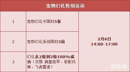 2月5日-2月12日、2月19日期间每天14:00-17:00,游戏内将会开启特别活动,宠物强化、宠物幻化、赛车源计划等活动限时优惠,千万不要错过哦!