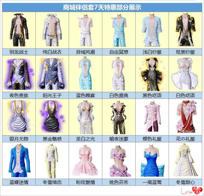 2.11-2.17,商城光效伴侣套7天期限仅需100金币/点券,下图中浅黄色部分套装上架后,将不再下架,心动不如行动,快来和亲爱的Ta一起买买买吧~