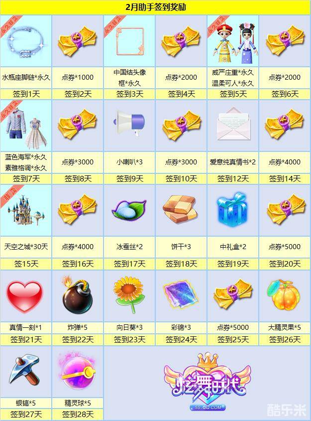 2月助手在指定日期签到还有特别福利呦~超人气黑白套装、大量实用道具、28266点券,只要按照图中指定日期登录手机助手APP进入签到界面即可免费领取!