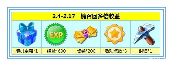 2.4-2.17,一键召回多倍收益让你新年满载而归!丰富经验、活动点数、点券一键获取,更有可能随机获取永久情侣套装以及心动道具哦~赶紧来召回吧!