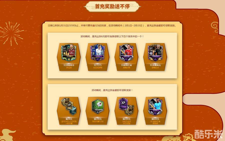 自游戏开服注册以来至2019年1月31日23:59:59为止,未有付费充值的玩家,在活动期间内,首充达到指定金额即可领取相应奖励。(首充达到6元时,可从奖池中的四名球员中任选一名球员作为奖励领取,且该档次奖励只能领取一次。其余档次的奖励,只要首充到达指定金额即可领取。直购礼包不被计算至充值金额。)