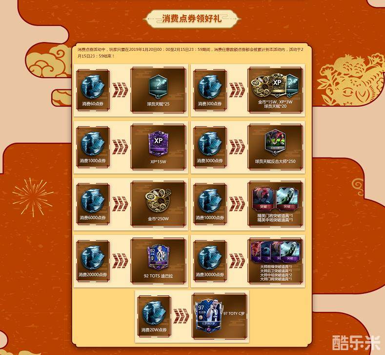 消费点券活动中,玩家在2019年1月20日00:00:00至2019年2月15日23:59:59期间,消费任意数额的点券都会被累计到本活动内,消费行为在2019年2月15日23:59:59后停止计算,在活动期间,只要玩家消费点券达到指定数额,即可领取相应奖励。