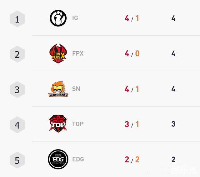 作为S8全球总决赛冠军,IG的表现依旧强势,一共5场BO3,4场都是2:0,虽然1:2负于JDG,但是在净胜分上还是位列榜首。各条线都保持着极好的竞技状态,如果年后能更上一次楼的话,会是春季赛冠军的有力竞争者。