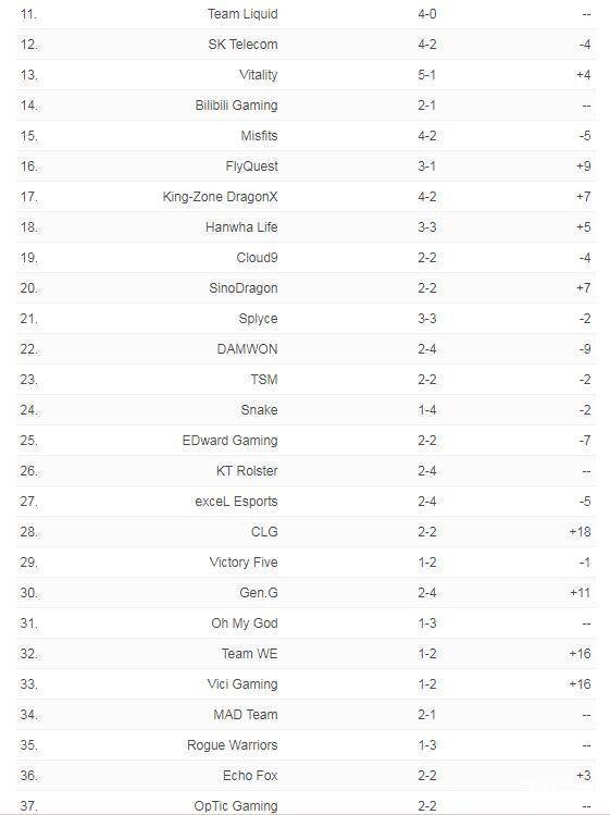 国外媒体ESPN更新了最新的全球战队排行榜,格里芬继续位居第一,IG上升到第二名,上周的第二苏宁有所下降。不过需要注意的是,几支LPL队伍由于没有比赛所以名次没什么变化,并不一定能够代表他们目前的状态。