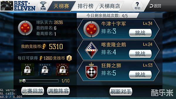 天梯赛名次越靠前,每天获得的竞技币越多,竞技币可以在天梯商城兑换球员和道具。进入天梯赛就可以直接进行挑战了,名次进入前20时就需要好好研究对方的实力和球队技能了,所以查看天梯前20名球员实力是必不可少的,当然偶尔输给对手也正常的,毕竟足球是圆的么,嘿嘿!