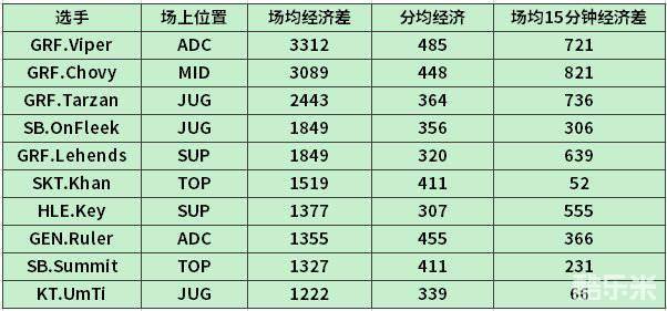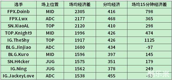 不过IG确实还是强,可以看到本次榜单IG共有三名选手上榜,在分均经济和场均经济差上都有着很不错的数据,不过最恐怖的还的是IG的上单选手Theshy,在场均15分钟经济差这个点上,Theshy是唯一过千的选手,这可以说是相当的恐怖了,这样的数据说Theshy前15分钟是在线抢钱也不为过,也难怪现在的LPL选手都把Theshy当作第一对手。