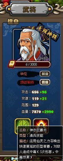 综合评价:此无双神将与无双诸葛亮 旗鼓相当。技能比诸葛略胜一筹 华佗技能神农巨藤术 要比 诸葛的河图星空阵减速效果好,但竞技PK技能不如诸葛亮的 封魂锁魄 ,三围攻速太底。与诸葛,貂蝉同属推图给力武将,推图爱好者可选择此神将(其实华佗PK 要是个有个起死回生的技能该多好。)