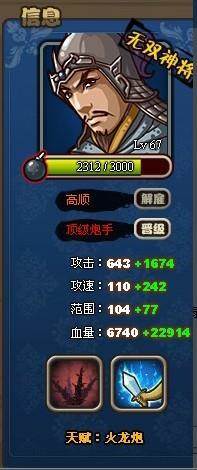 综合评价:此神将性价比也不错,天赋与无双何进一样,同职业放弃天赋进晕塔都是好炮手,技能是最大亮点,比何进的万剑火雨更实用,其减速技能超越水毒。平民玩家可摆脱85+还用绿水度神将 区星 推图的尴尬。竞技四级战斗之心为主流PK技能,唯一不足之处,速度比何进慢了18点之多,可做过度备用战斗之心竞技武将。